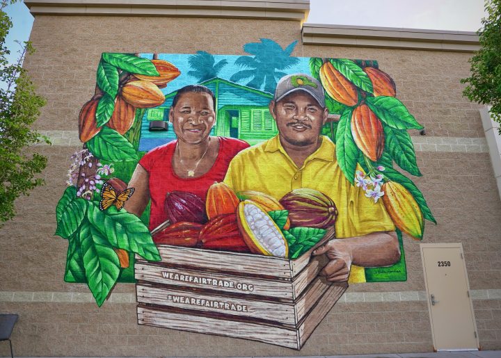 • Image of mural depicting sibling cocoa farmers from Dominican Republic with cocoa pods.