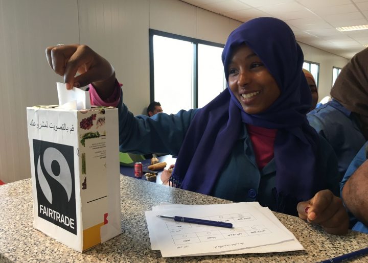 • Woman in Tunisia voting on Fairtrade Premium project.